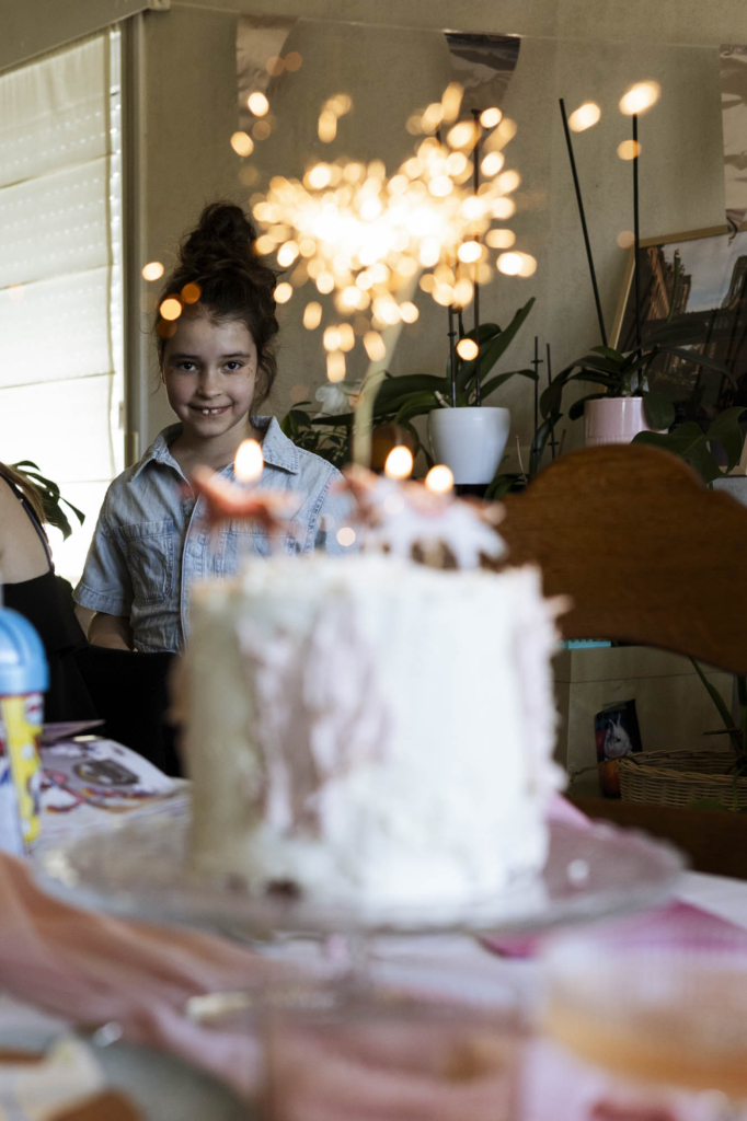 Omdat ik een lang verlof had, organiseerden we Emma’s verjaardagsfeestje in dat verlof. Op die manier kon ik rustig voorbereiden en hadden we achteraf ook tijd voor de opkuis. Ik maakte opnieuw de feesttaart uit het boek van Chez Mariette: bommetje, maar o zo lekker! Ik had voor het eerst ook een ĂŠcht thema voorzien: paardjes. Sinds Emma hippotherapie volgt, is ze verzot op paarden dus paarden overal op haar feestje. Ze genoot met overvolle teugen en is zowaar beginnen dansen. Een soort van mini optreden voor “haar” gasten. Dat was meteen ook genieten voor ons.